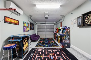- Air-conditioned garage game room with multiple arcade machines and lounge seating