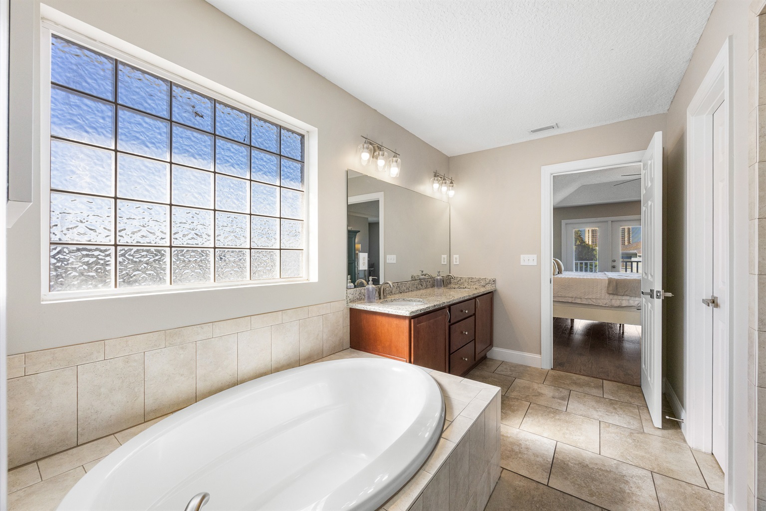 - 3rd floor: large primary suite with king bed, soaking tub, walk-in closet, double vanity, separate shower + private balcony with peek ocean views